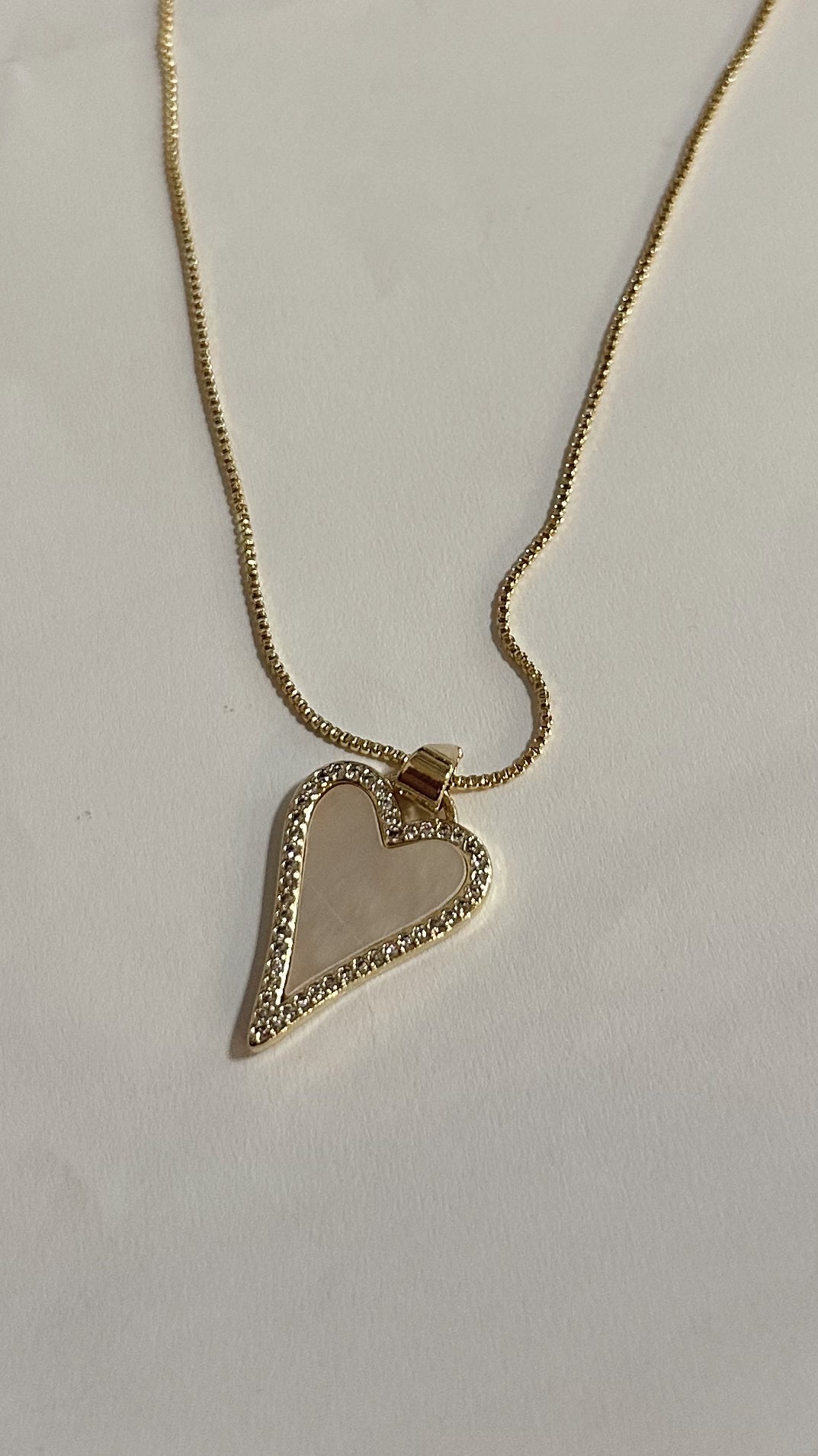 Elegant mother of pearl heart pendant catches the light with delicate rhinestone accents, suspended from a refined box chain. The adjustable slider closure ensures a perfect fit for any occasion. This timeless piece combines lustrous pearl with sparkling details for an understated yet striking accessory that transitions effortlessly from day to evening wear.