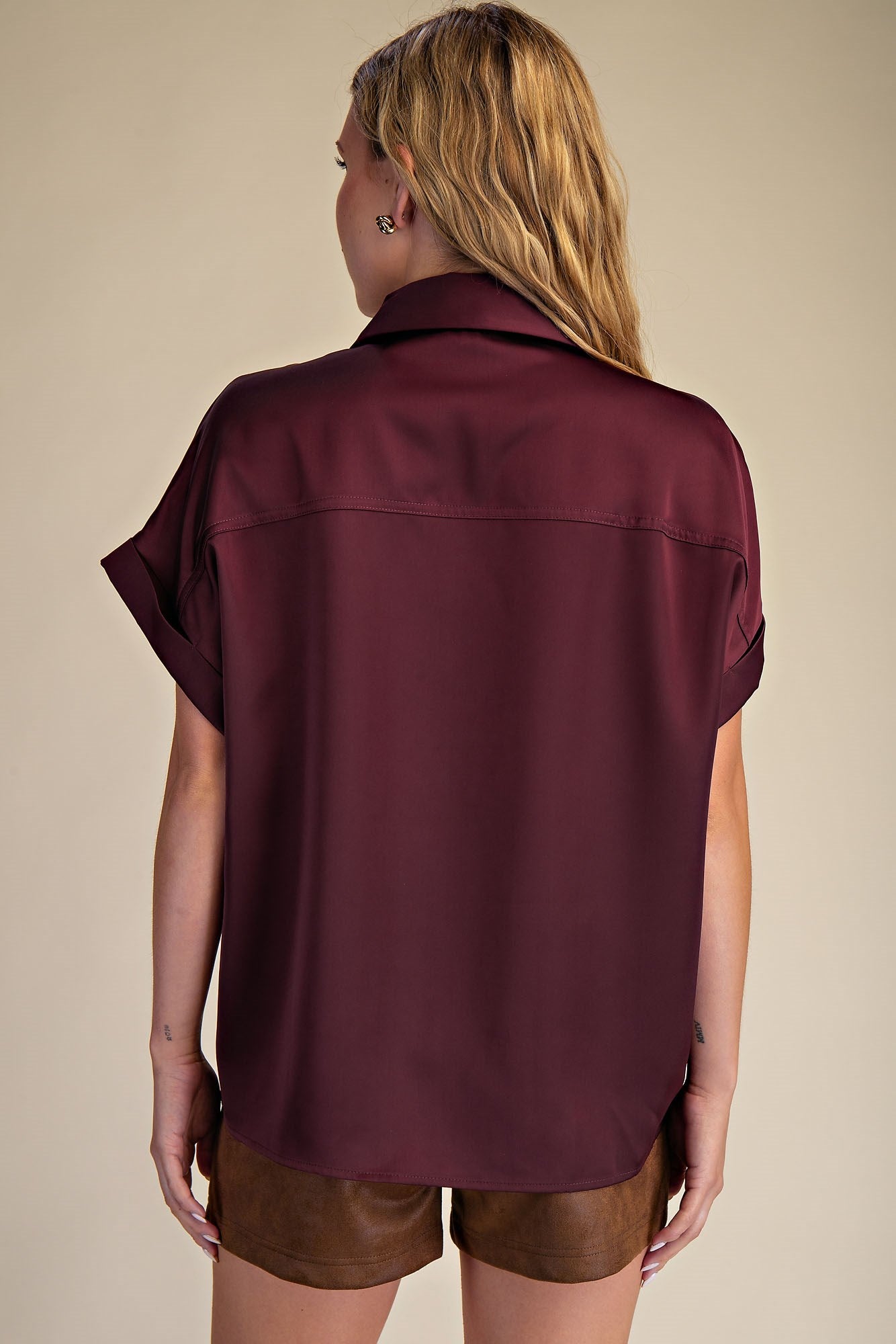 Elevate your wardrobe with this High Class Collared Satin Button Up Blouse in rich Burgundy. Crafted from smooth, shiny satin, it offers a luxurious feel and a sleek silhouette. The loose, relaxed fit with cuffed short sleeves ensures comfort and effortless style, making it an essential piece for any season. Perfect for both professional settings and elegant evenings, this blouse is a timeless staple that exudes sophistication.