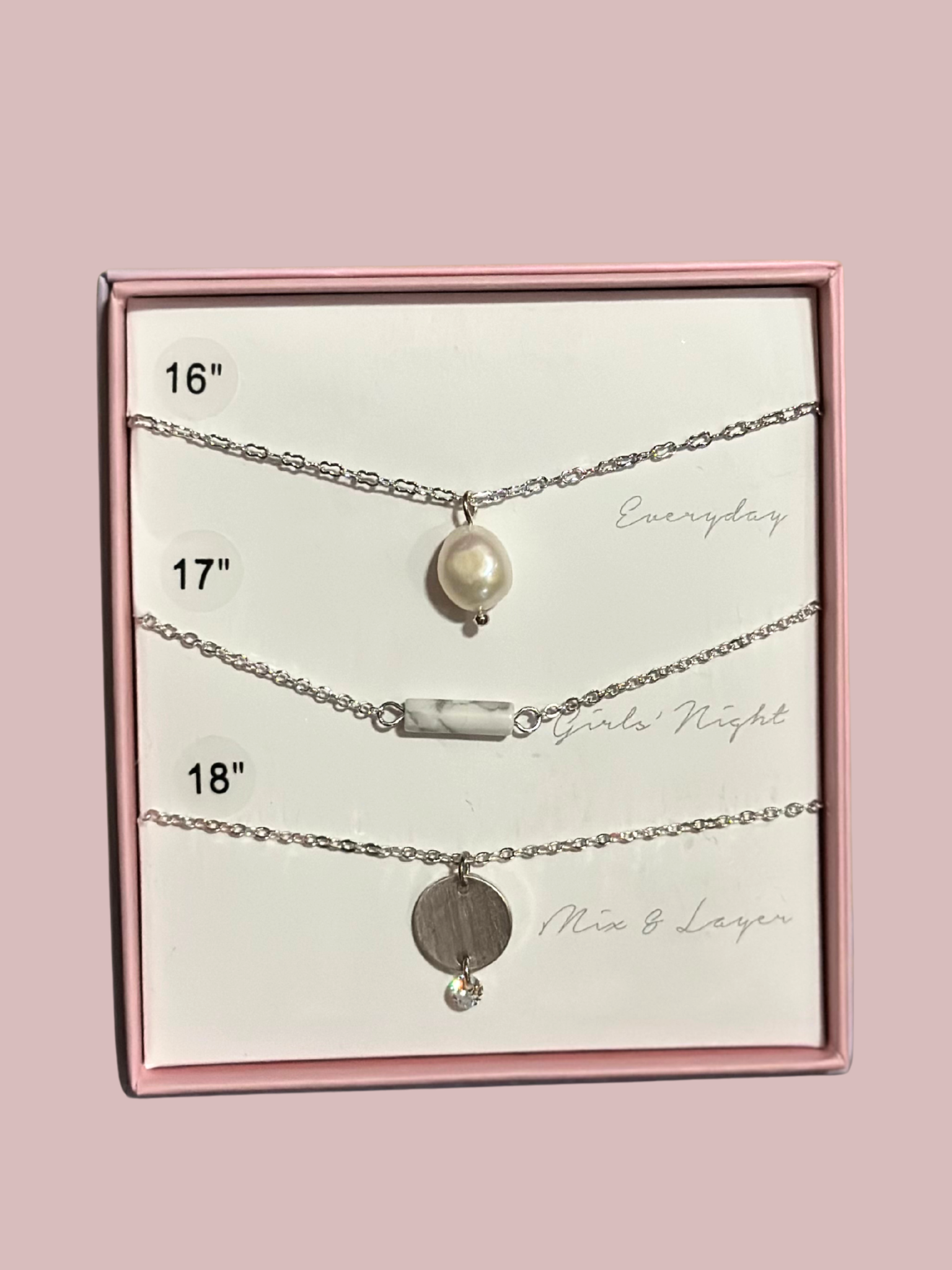 Elevate your everyday elegance with this curated trio of silver necklaces, thoughtfully presented in a refined gift box. Each piece complements the others, allowing you to layer for dimension or wear individually to suit your mood. Crafted with attention to detail, this collection offers versatile styling options for both casual and refined occasions. Perfect as a gift for someone special or a meaningful addition to your own jewelry wardrobe.