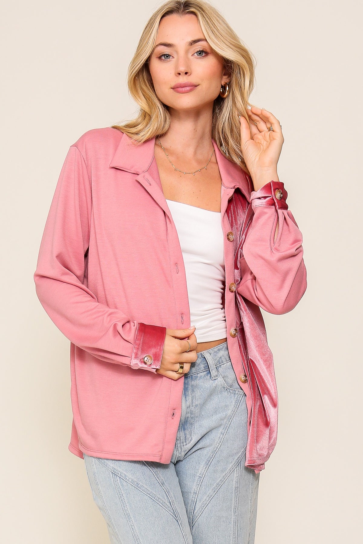 Uniquely Chic Two-Toned Contrast Velvet Detail Button Up Top - Rose