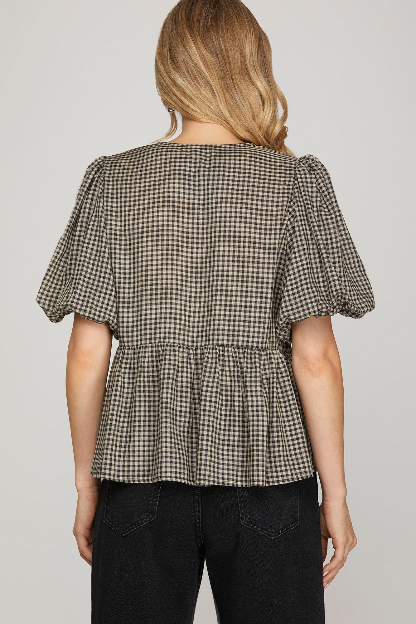 Elevate your everyday wardrobe with this charming gingham top, featuring delicate velvet embroidery that adds refined texture and visual interest. The classic black and white check pattern pairs effortlessly with tailored trousers or casual denim, while the short puff sleeves and front bow tie detail create a polished, feminine silhouette. Crafted from a luxurious rayon-polyester blend, this baby doll cut offers comfortable wear with an understated elegance. Perfect for transitional seasons and versatile enough for both professional and weekend styling.