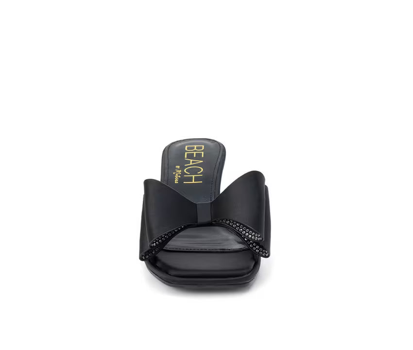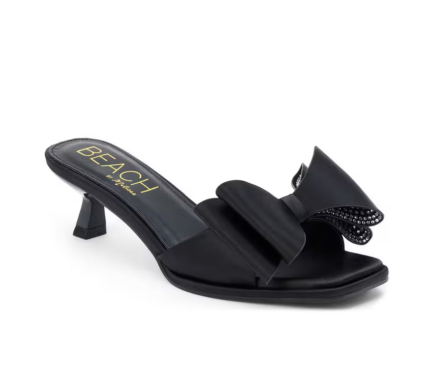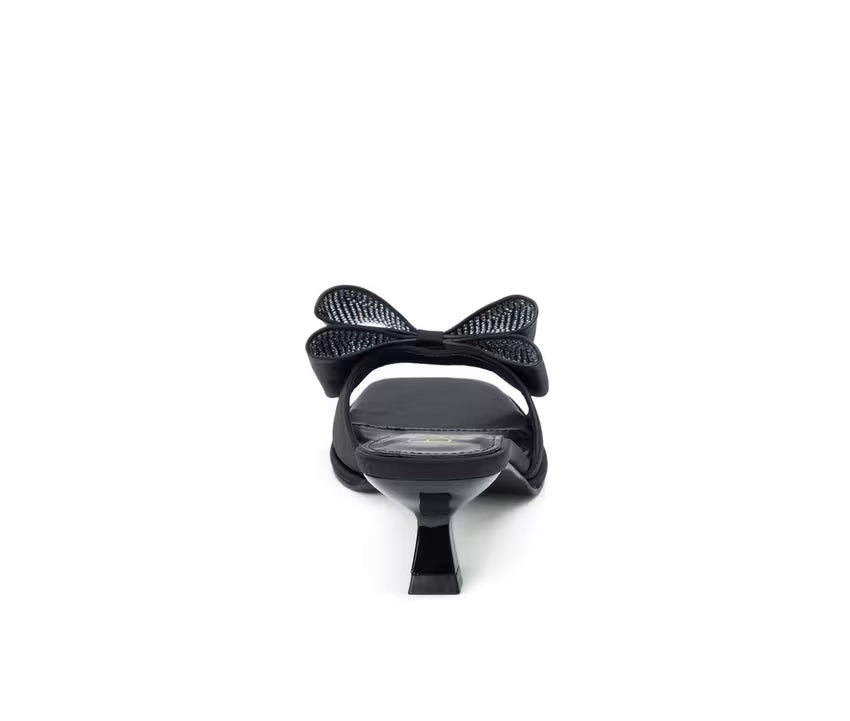 Turn heads with every step in this playful yet elegant heeled sandal designed to add flair to dressy outfits. Featuring an oversized bow accent and open-toe silhouette, this style blends charm and sophistication in all the right ways. The sleek synthetic upper and slip-on design offer both ease and a streamlined look, while the sculpted kitten heel provides just enough lift for special occasions or stylish nights out. It’s a standout piece that’s equal parts fun and fashion-forward.