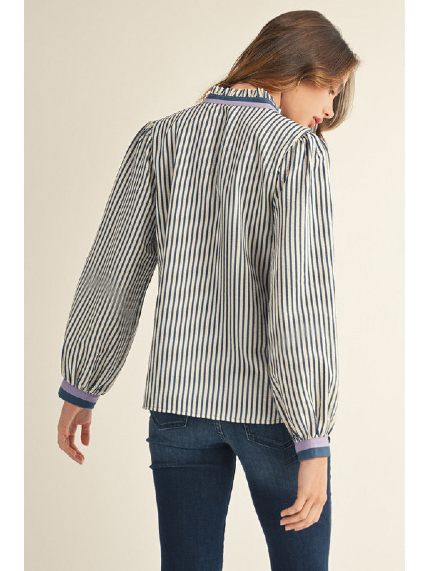 Elevate your wardrobe with the Daisy If You Do Denim Striped Contrast Trim Top. This sophisticated button-down features long sleeves with buttoned wrist cuffs, a delicate ruffled neckline, and a striking solid contrast binding that enhances its classic striped pattern. Perfect for blending timeless style with refined details.