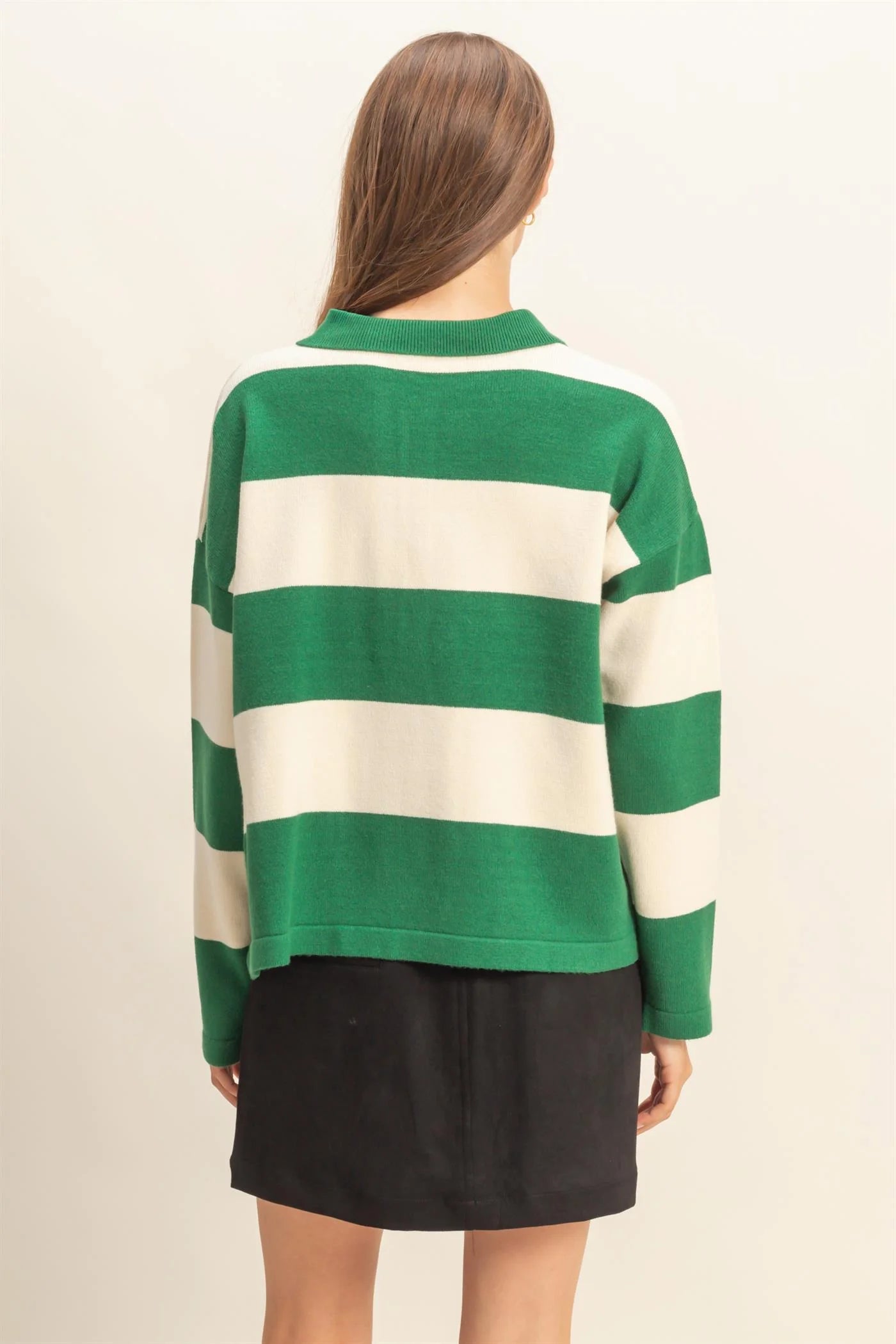 Styled In Stripes Polo Button Collar Sweater Top - Green